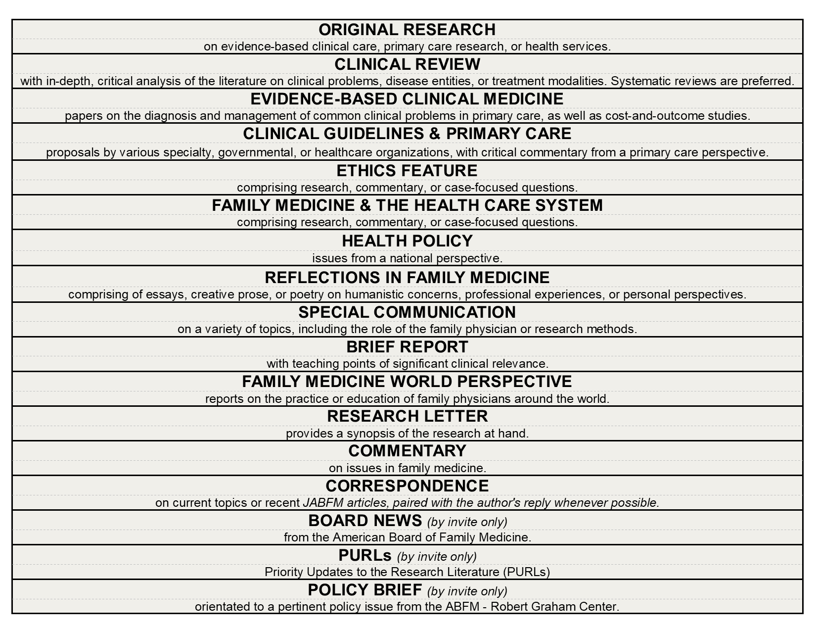 JABFM publishes original material from authors with new knowledge to contribute to the understanding and advancement of family medicine research and clinical practice. JABFM also serves as an important forum for the specialty of family medicine, and as a source of news from the ABFM.