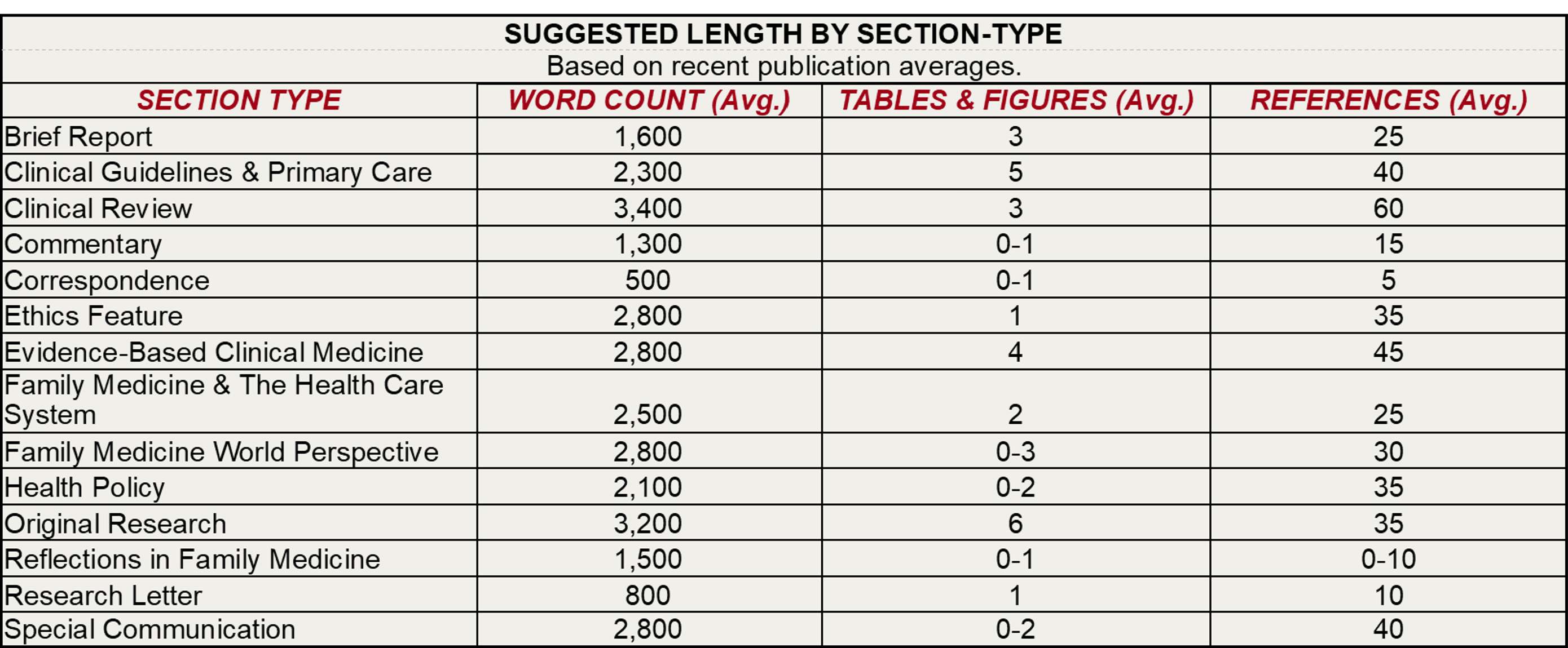 *Please note that the suggested lengths by section type are guidelines based on recent publication averages. The Journal is flexible with these counts, within reason.